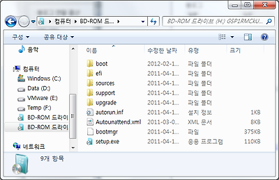 그럼 먼저 작업을 진행하기 전에 윈도우 7 설치 DVD 의 파일 구성을 잠깐 보도록 하겠습니다.