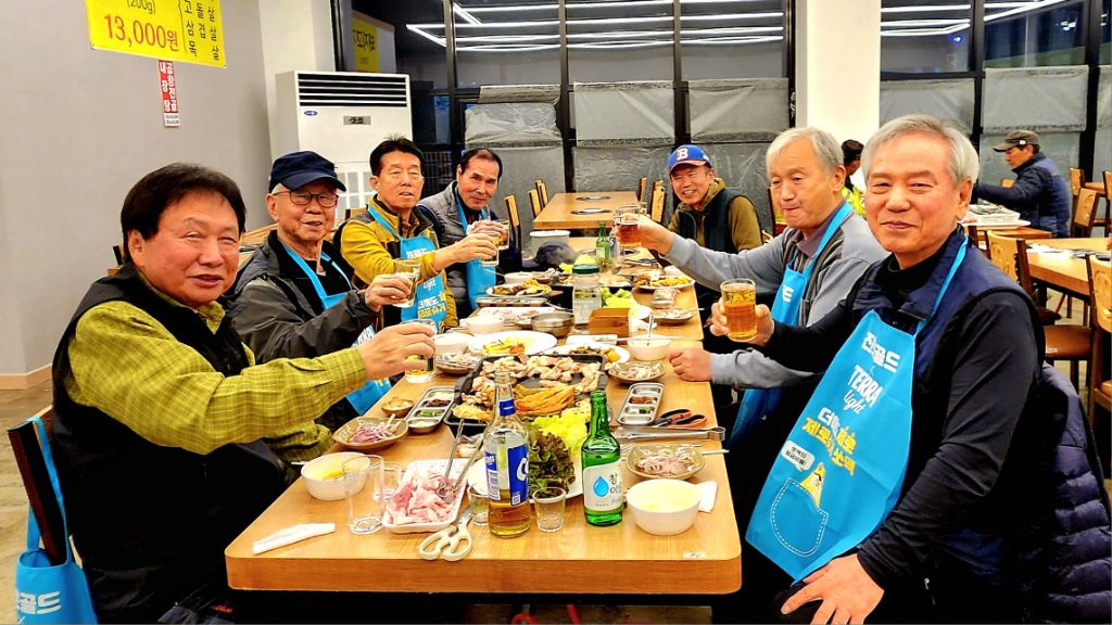 18:00 자연한식부페에서 삼겹살·뒷고기·맥주·소주·잔치국수·호박죽·갖은 반찬 등으로 뒤풀이를 했다. 매번 두 번씩 왕복하신 장경순님과 회원님들의 건강을 위한 건배를 시작으로 뒷고기를 맛있게 먹었다.