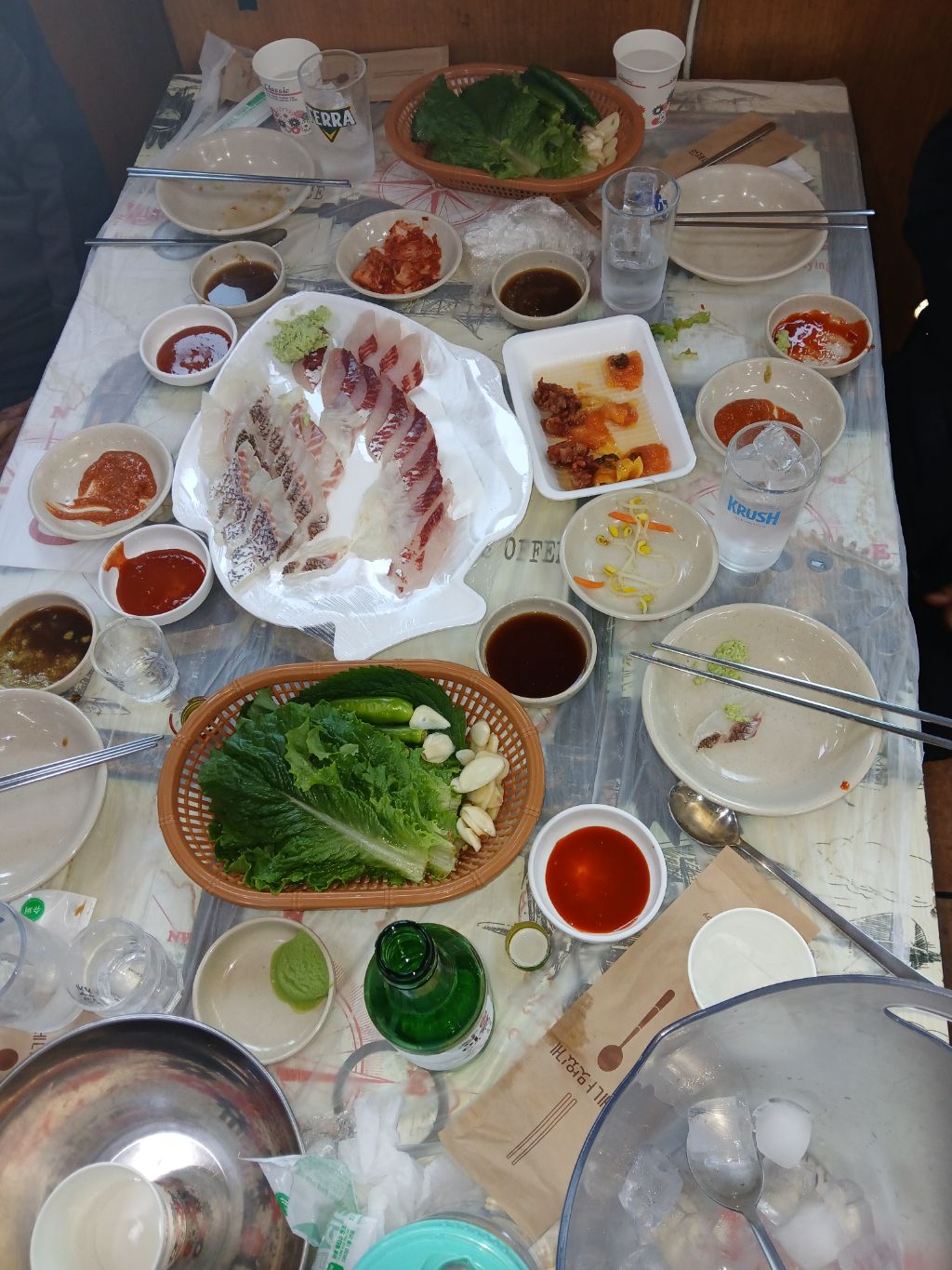 7715번 버스를 타고 마포농수산물센타에 도착 후, 도미회&숭어회&멍게를 주문해, 소주와 함께 담소를 나누며, 즐거운 시간을 보냈고, 매운탕과 라면사리 2개를 주문해서 먹고 마무리 지었습니다.
