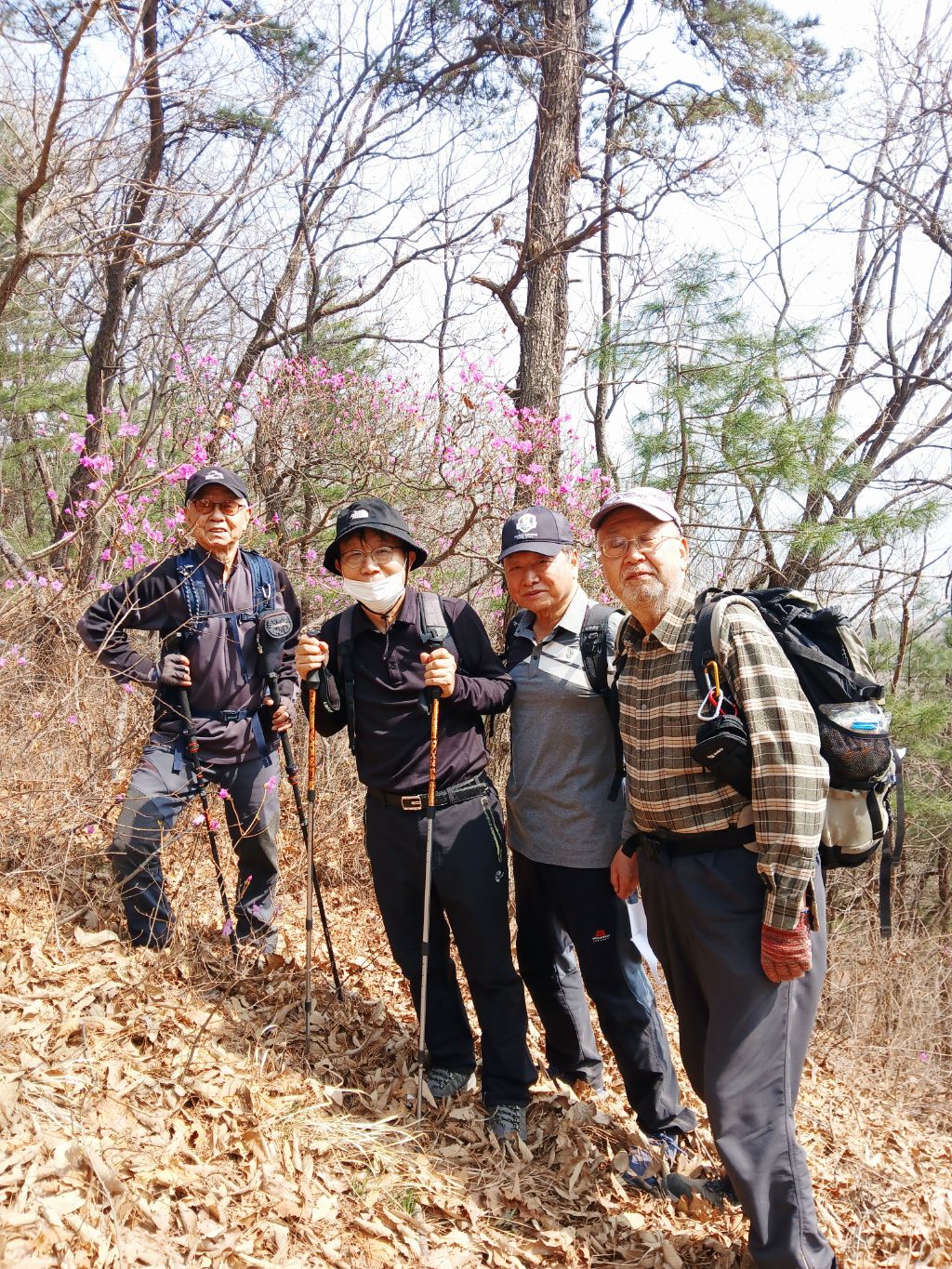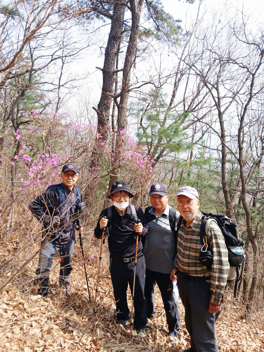 그리고 걷다가 진달래꽃 있는데서 인증샷을 찍는데, 지나가던 사람이 넷이서 찍을 수 있도록 도와주셨습니다.
