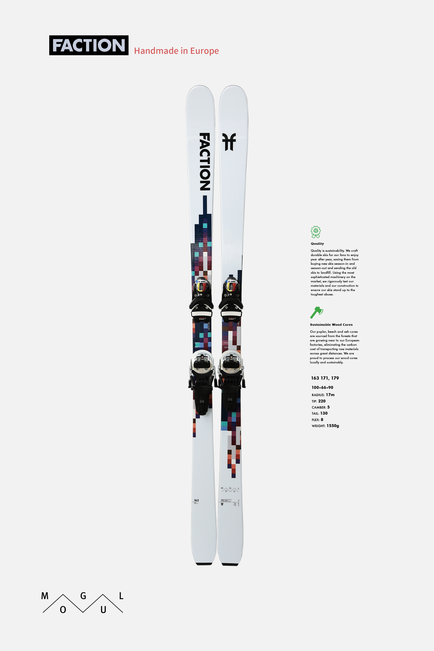 팩션모글스키는 좀 더 와이드한 베이스에 사이드 커브가 짧아 ‘모글 카빙턴’이 잘되는 스키로 잘 알려져 있으며,