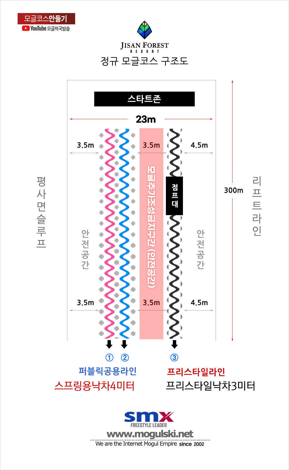 4. 코스 제원 : 스프링 대응으로 퍼블릭 2개라인 4미터 + 모글 키커포함 프리스타일 라인 1개라인