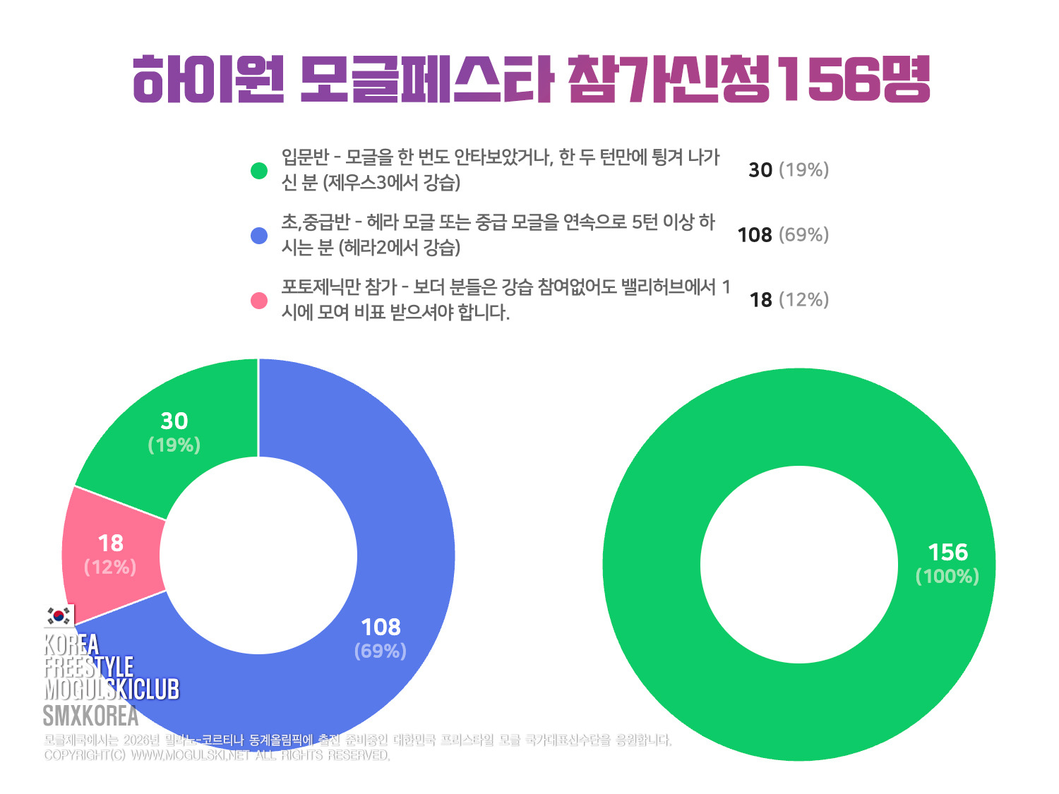 네이버 폼으로 참가 신청자는 총 156명으로 홍보 4일만에 전국에서 몰린 모글스키어로 하이원 모글이 모처럼 북적였습니다.