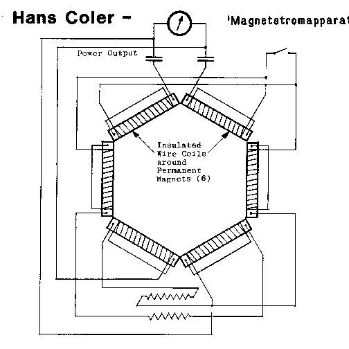This 'Free-Energy' generator was developed in the 1930's and produced an output of 12 volts. This device is a solid-state unit consisting of only permanent magnets, copper coils and condensers in a static arrangement. A follow-up device called a 'Stromzeuger' was developed by Mr. Coler from which he claimed that with an input of a few watts of power from a dry battery, an output of 6,000 watts could be obtained indefinitely.