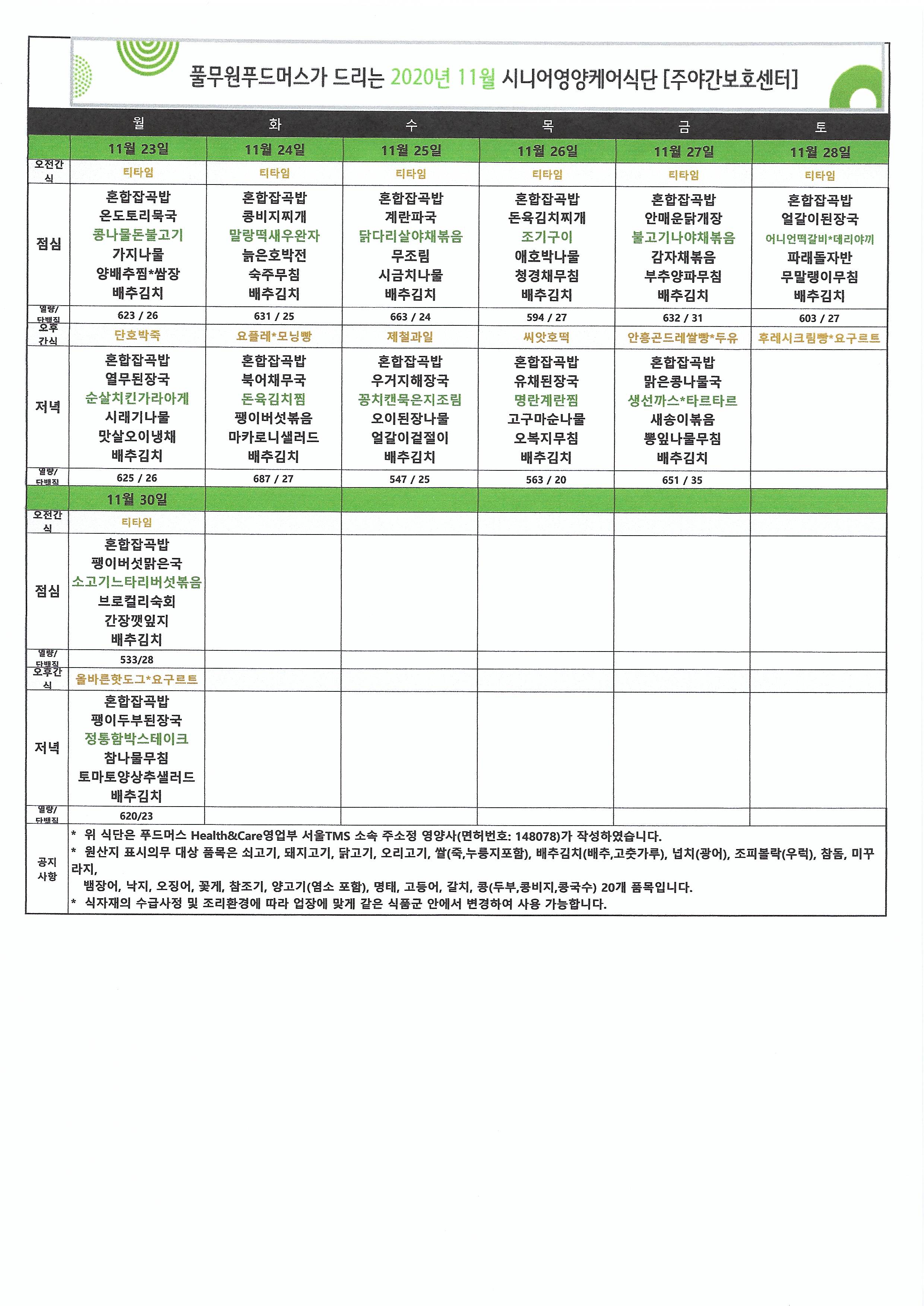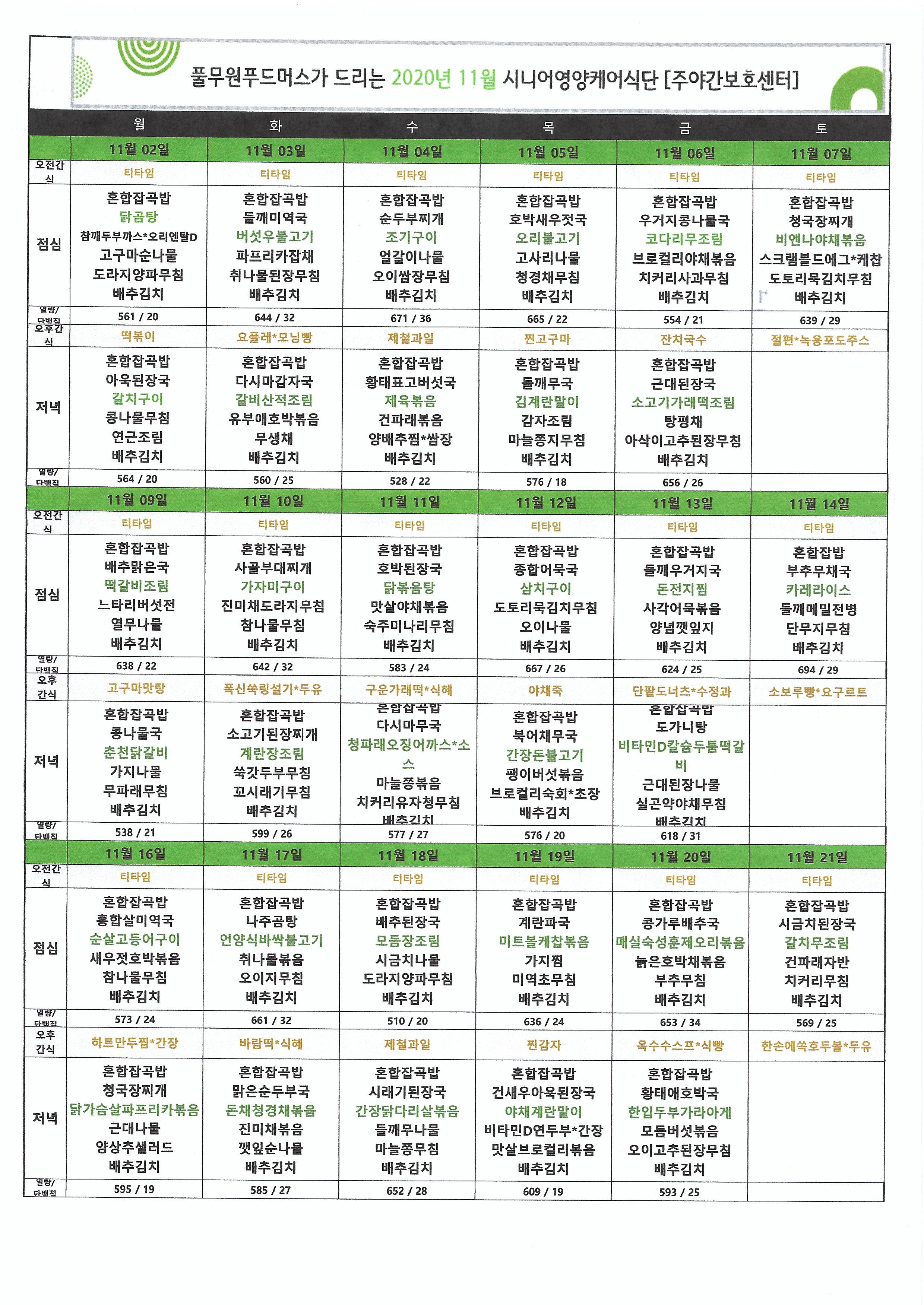 [식단자료]2020년 11월 식사 및 간식 작성자목민데이케어센터|작성시간20.10.31|조회수24 목록 댓글 0 글자크기 작게가 글자크기 크게가 다음검색 현재 게시글 추가 기능 열기 북마크 공유하기 신고 센터로 신고 댓글 댓글 0 댓글쓰기 답글쓰기 댓글 리스트