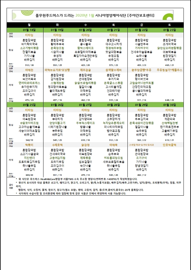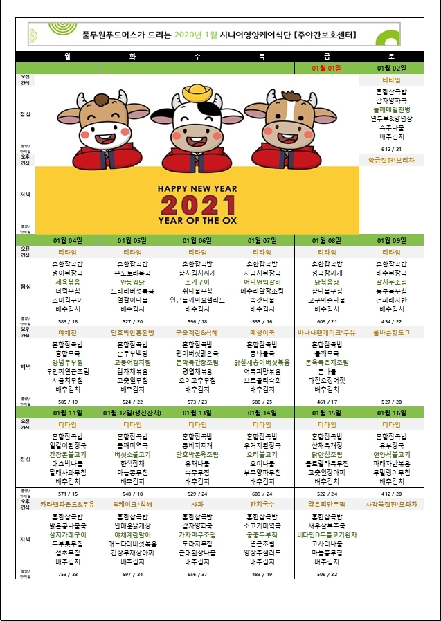 [식단자료]2021년 01월 식사 및 간식 작성자목민데이케어센터|작성시간20.12.31|조회수29 목록 댓글 0 글자크기 작게가 글자크기 크게가 다음검색 현재 게시글 추가 기능 열기 북마크 공유하기 신고 센터로 신고 댓글 댓글 0 댓글쓰기 답글쓰기 댓글 리스트