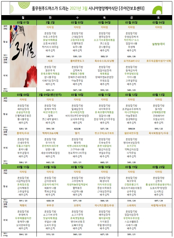 [식단자료]2021년 03월 식사 및 간식 작성자목민데이케어센터|작성시간21.02.26|조회수26 목록 댓글 0 글자크기 작게가 글자크기 크게가 다음검색 현재 게시글 추가 기능 열기 북마크 공유하기 신고 센터로 신고 댓글 댓글 0 댓글쓰기 답글쓰기 댓글 리스트