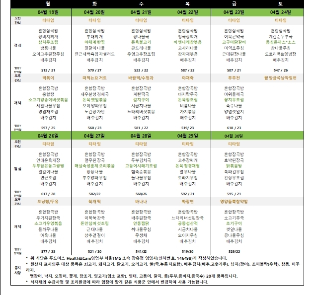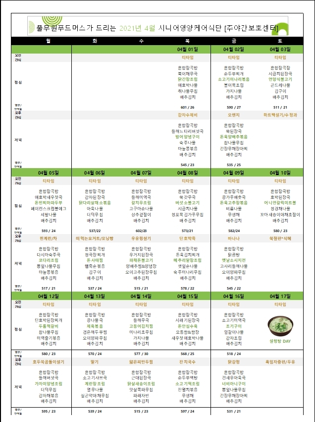 [식단자료]2021년 04월 식사 및 간식 작성자목민데이케어센터|작성시간21.03.31|조회수21 목록 댓글 0 글자크기 작게가 글자크기 크게가 다음검색 현재 게시글 추가 기능 열기 북마크 공유하기 신고 센터로 신고 댓글 댓글 0 댓글쓰기 답글쓰기 댓글 리스트