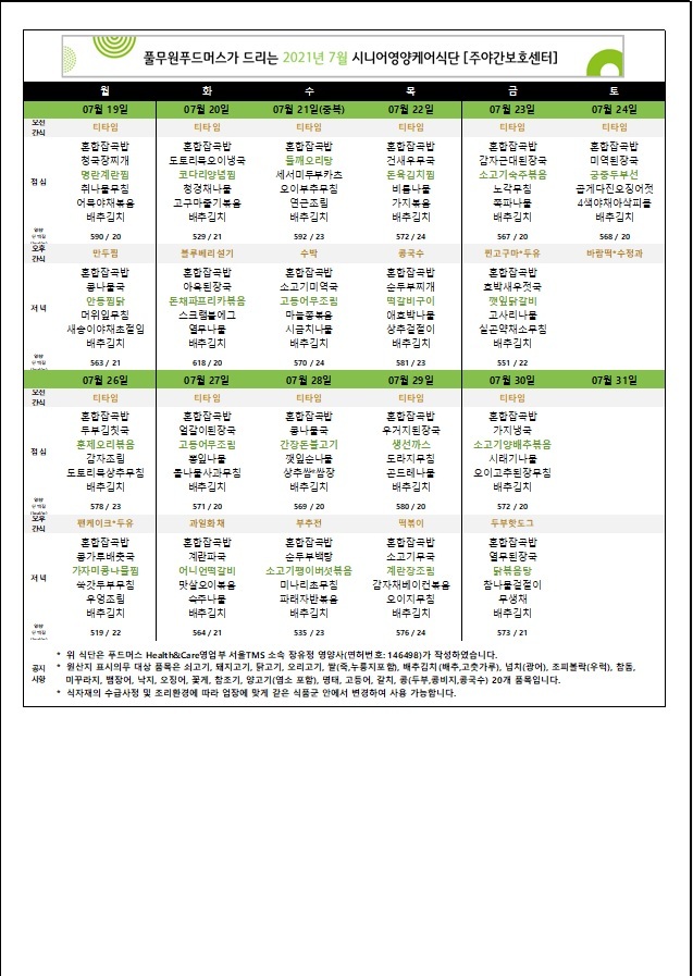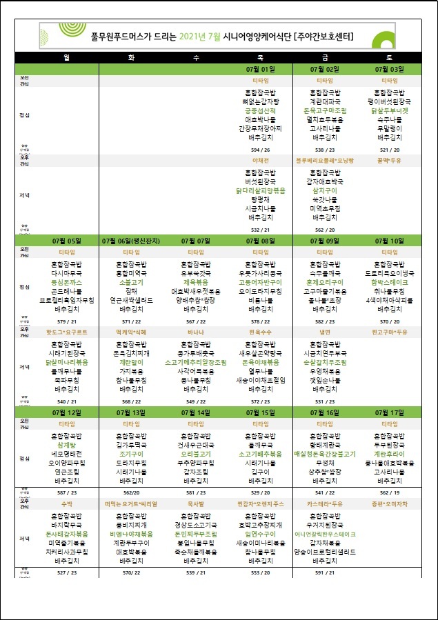[식단자료]2021년 07월 식사 및 간식 작성자목민데이케어센터|작성시간21.07.02|조회수16 목록 댓글 0 글자크기 작게가 글자크기 크게가 다음검색 현재 게시글 추가 기능 열기 북마크 공유하기 신고 센터로 신고 댓글 댓글 0 댓글쓰기 답글쓰기 댓글 리스트