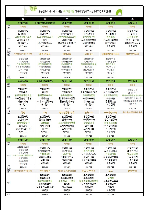[식단자료]2021년 08월 식사 및 간식 작성자목민데이케어센터|작성시간21.07.30|조회수23 목록 댓글 0 글자크기 작게가 글자크기 크게가 다음검색 현재 게시글 추가 기능 열기 북마크 공유하기 신고 센터로 신고 댓글 댓글 0 댓글쓰기 답글쓰기 댓글 리스트