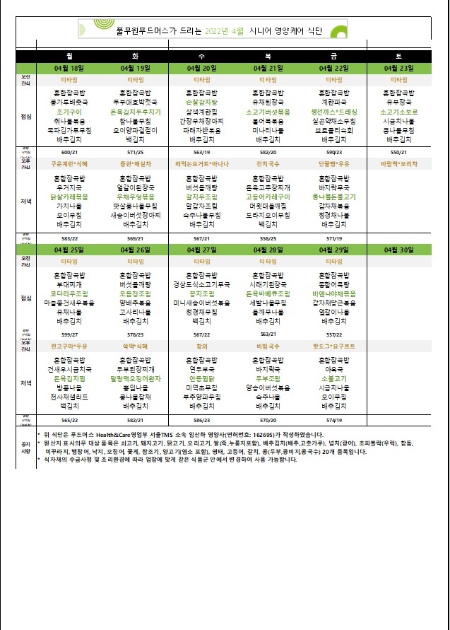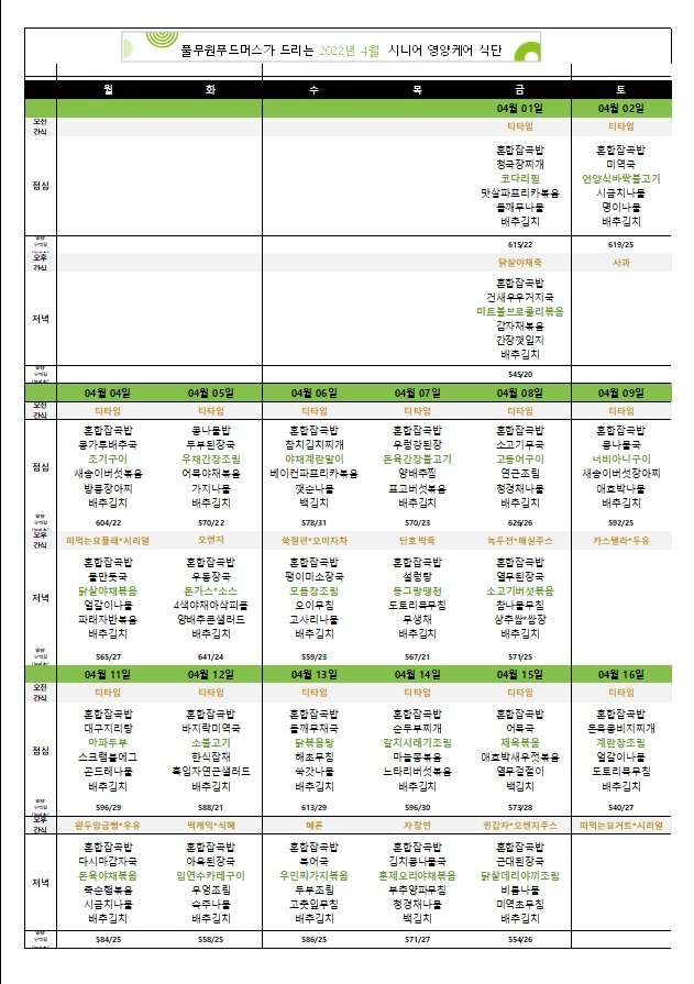 [식단자료]2022년 04월 식단 및 간식 작성자목민데이케어센터|작성시간22.03.31|조회수31 목록 댓글 0 글자크기 작게가 글자크기 크게가 다음검색 현재 게시글 추가 기능 열기 북마크 공유하기 신고 센터로 신고 댓글 댓글 0 댓글쓰기 답글쓰기 댓글 리스트