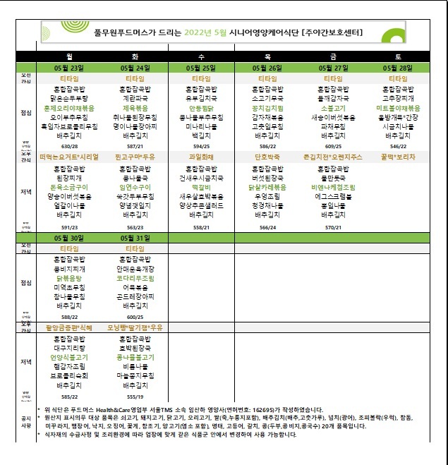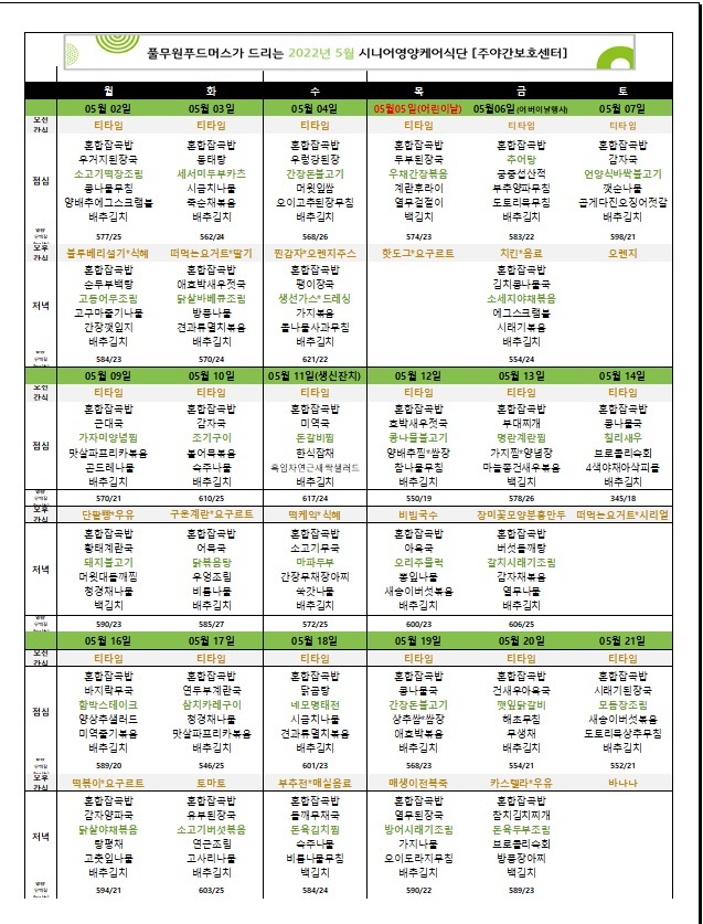 [식단자료]2022년 05월 식단 및 간식 작성자목민데이케어센터|작성시간22.05.15|조회수23 목록 댓글 0 글자크기 작게가 글자크기 크게가 다음검색 현재 게시글 추가 기능 열기 북마크 공유하기 신고 센터로 신고 댓글 댓글 0 댓글쓰기 답글쓰기 댓글 리스트