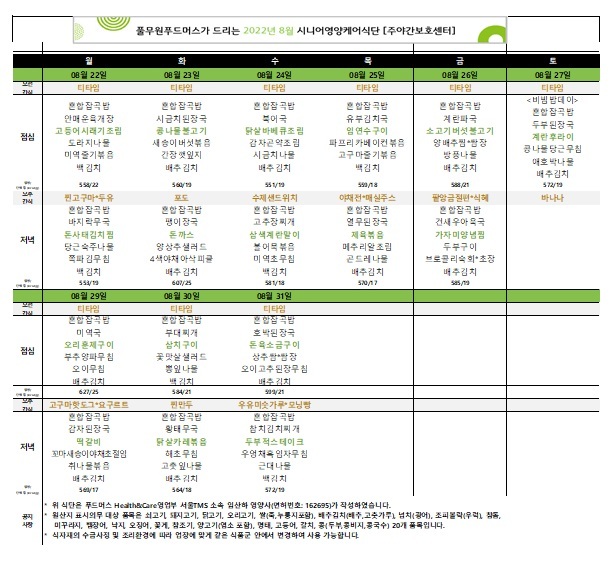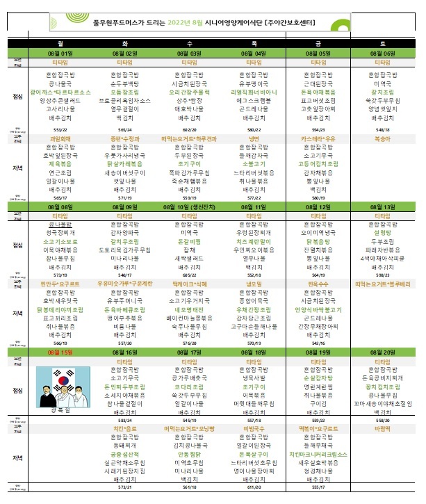 [식단자료]2022년 08월 식단 및 간식 작성자목민데이케어센터|작성시간22.07.31|조회수36 목록 댓글 0 글자크기 작게가 글자크기 크게가 다음검색 현재 게시글 추가 기능 열기 북마크 공유하기 신고 센터로 신고 댓글 댓글 0 댓글쓰기 답글쓰기 댓글 리스트