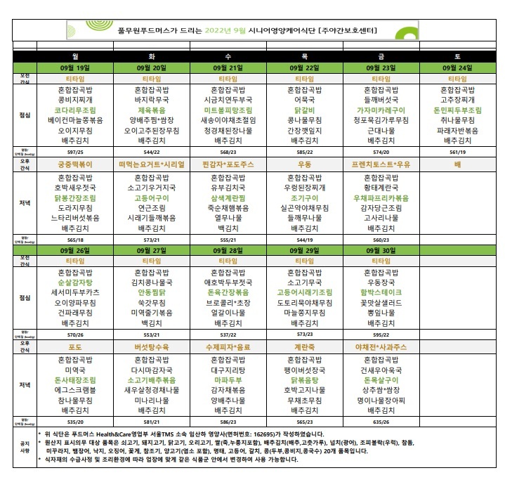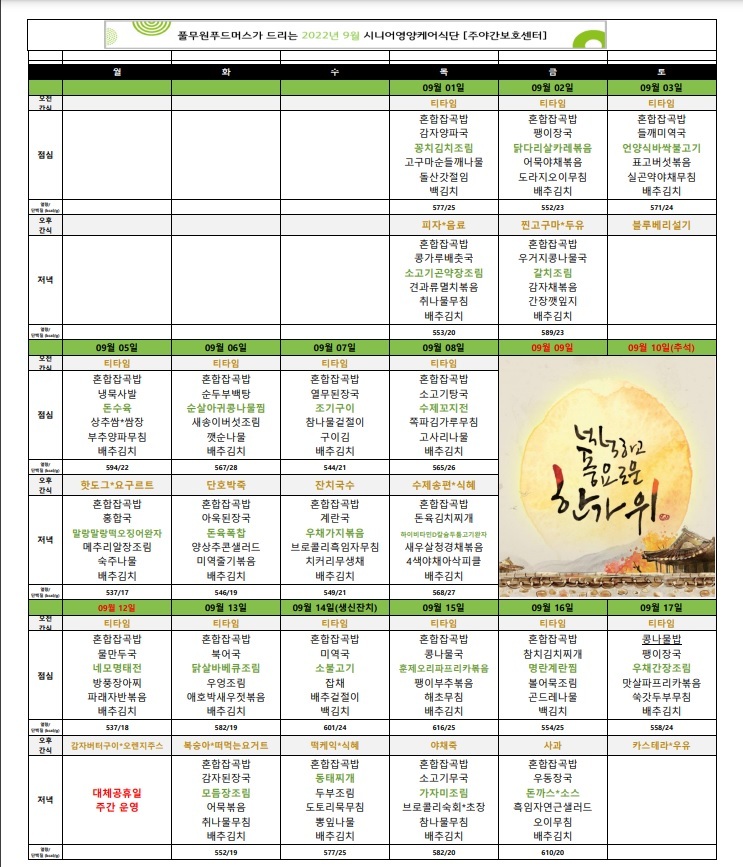 [식단자료]2022년 09월 식단 및 간식 작성자목민데이케어센터|작성시간22.08.31|조회수34 목록 댓글 0 글자크기 작게가 글자크기 크게가 다음검색 현재 게시글 추가 기능 열기 북마크 공유하기 신고 센터로 신고 댓글 댓글 0 댓글쓰기 답글쓰기 댓글 리스트