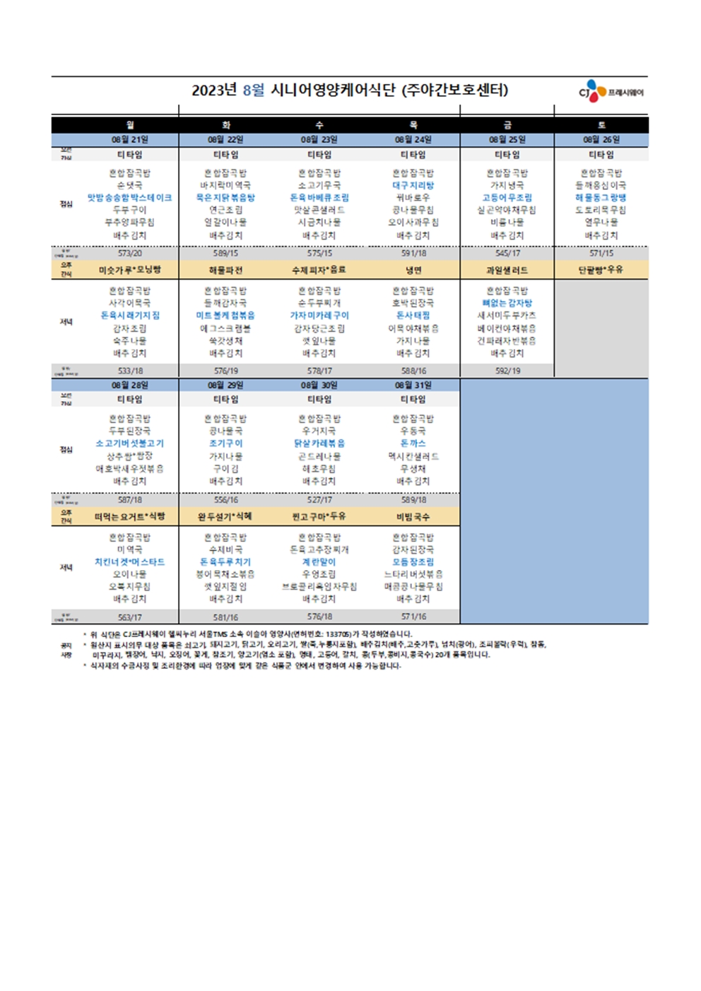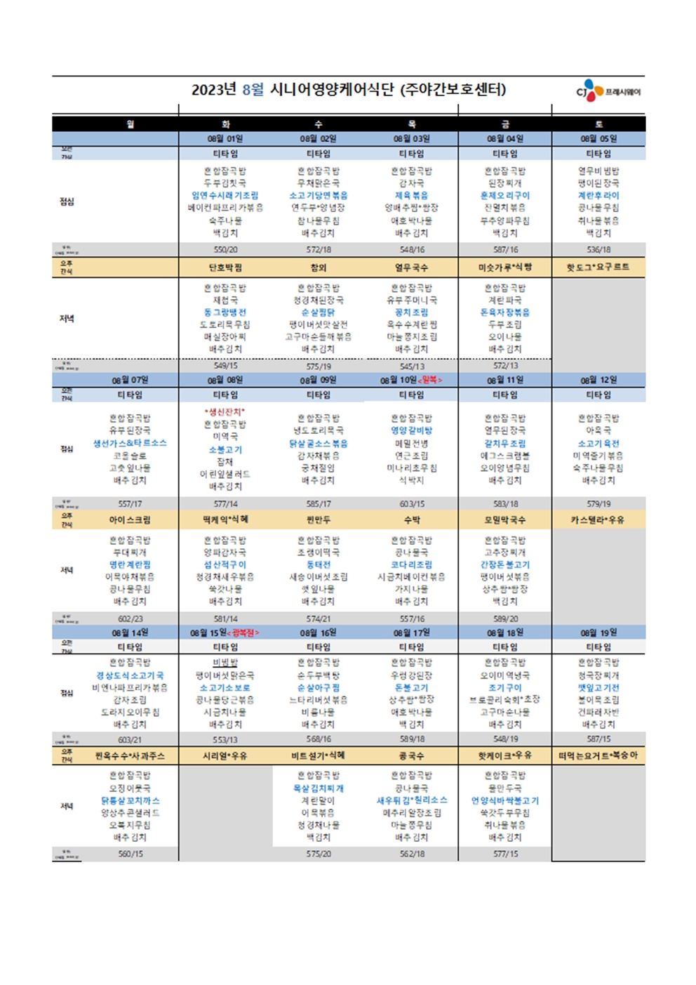 [식단자료]2023년 08월 식단 및 간식 작성자목민데이케어센터|작성시간23.07.31|조회수44 목록 댓글 0 글자크기 작게가 글자크기 크게가 다음검색 현재 게시글 추가 기능 열기 북마크 공유하기 신고 센터로 신고 댓글 댓글 0 댓글쓰기 답글쓰기 댓글 리스트