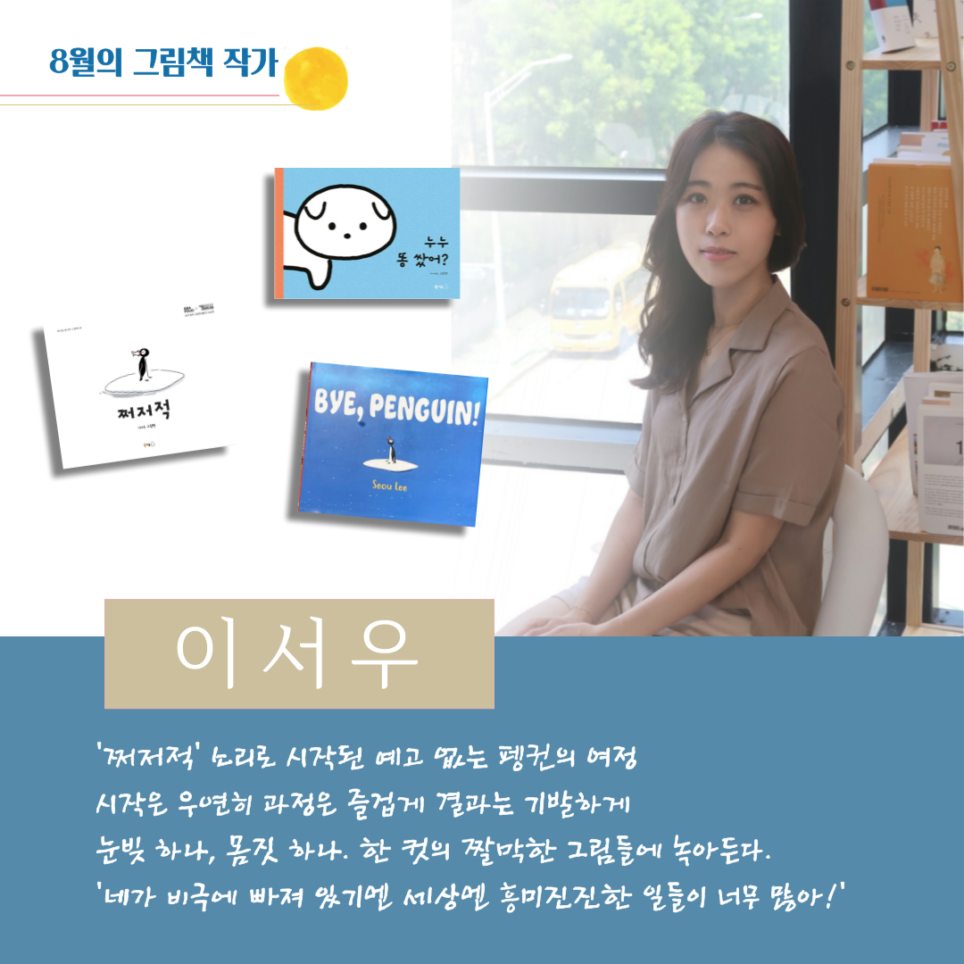 [이서우 작가]  어린이집을 운영하는 부모님 덕분에 여러 그림책을 접하며 유년기를 보냈습니다. 현재 그림책 작가이자 애니메이터로 활동 중입니다. 세상의 따뜻하고 유쾌한 이야기들을 그려 나가고자 합니다. . 놀이방에 수많은 장난감이 있었지만 제가 가장 좋아한 것은 책이었습니다. 각종 전래동화와 그림책들을 읽었으며 특히 오즈의 마법사는 책이 두 동강이 나서 테이프로 다시 붙여 읽을 정도로 좋아했습니다. . 중학생 때부터는 만화를 그려 공모전에 도전하였고, 고등학생 때는 학교를 자퇴하고 게임 사이트에 만화를 연재하기 시작했습니다. . 대학생 때는 무성 애니메이션의 매력에 빠져 <쩌저적> 스토리 보드를 만들었습니다. . 2017년 상상만발 책그림전 소식을 접한 뒤 <쩌저적> 이야기를 그림책으로 출품하여 당선되었습니다. 2018년 북극곰에서 첫 그림책 <쩌저적>이 출간되었고, ‘2018년 우수도서’로 선정되었습니다. . 그리고 2020년 두 번째 그림책 <누누 똥 쌌어?> 출간되었습니다.