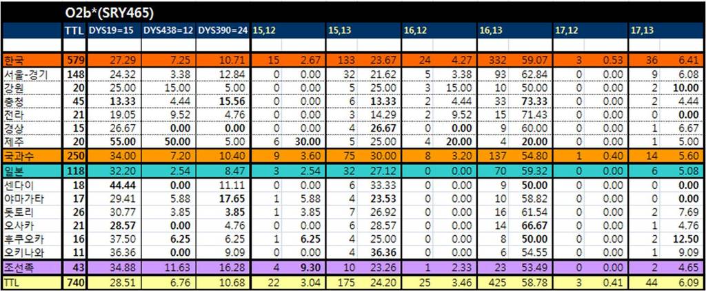 DYS19=17은 O2b1a에는 거의 보이지 않기 때문에, O2b임을 짐작하게 하는 중요한 좌위값인데요, 그만큼 O2b안에서만 주욱 진행된 변이라고 보시면 되겠습니다. 결국 16,13 조합이라는 표준 모델에서 KSC로 분화하지 않은 집단 중 (비교적 북방에 거주한 것으로 판단) 후기에 17,13 조합이라는 변이가 일어난 것으로 생각되며, 일본(5.4%), 조선족(4.7%)보다는 우리나라(6.4%)가 좀 더 높은 비율을 보이는데, 각자의 확률로 각자 이런 변이가 나타난 것으로 보입니다. 우리나라에는 강원도에 가장 높은 비율을 보이고 경상>서울-경기>제주의 순서를 보이는데, 워낙 샘플 수가 부족하기 때문에 단순 비교는 어렵겠지만, 강원도에 높은 비율, 그리고 서울-경기에 9명이나 보이는 점을 볼 때 중부 지방 또는 더 북부 지방을 중심으로 변이가 이루어지고, 이들이 남쪽으로 조금씩 내려와 현재의 분포를 보이고 있지는 않을지... 그리고 일본은 센다이, 야마가타에는 한 명도 없고, 후쿠오카>오키나와>돗토리 순서의 분포를 보이는데, 역시 일본에서도 남서부 지역이라는 특정한 지역에서 이런 변이가 이루어진 것으로 보입니다.