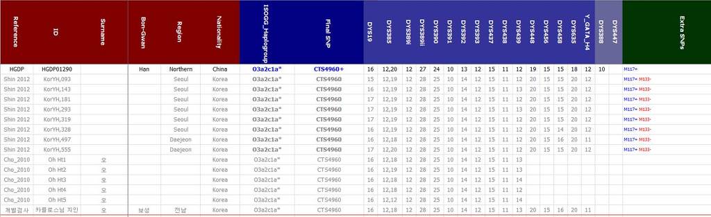 아쉽게도, 1KGP의 북경 샘플은 Y-STR 정보가 없습니다. 다만, HGDP의 북중국 샘플과 한국에서 M117+ M133-으로 나온 샘플 및 유사 샘플들을 비교해 보면, 몇몇 좌위값 외에는 상당히 유사함을 알 수 있습니다. 이들의 특징은, 대부분의 M117들이 DYS19=13에서 15 등의 낮은 값을 보이는 반면, CTS4960 집단은 대체로 16~17로 높은 값을 보이며(15도 있음), DYS385a가 12에 고정된 채, DYS385b는 17~20의 값을 보입니다. 또한, DYS458이 15 언저리에 위치한다는 것도 특징이겠습니다. 보성 오씨 샘플들은 SNP 정보가 없지만, Y-STR 추정상 거의 이 집단에 속하는 것으로 보이는데, 우리나님의 Y-STR 결과는 어떠할지 궁금하네요.