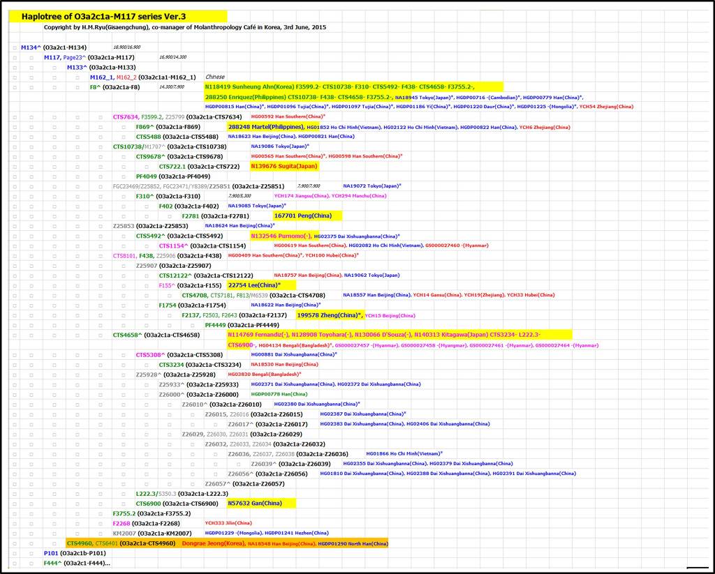 역시 예상대로 O3a2c1a-M117의 예하이고, O3a2c1a-M133에는 속하지 않으며 M133과 평행히 위치하는 O3a2c1a-CTS4960으로나왔습니다. 이 하플로그룹은 이미 1000 genome project(이하 1KGP)의 NA18548 북경샘플에서 그 존재가 입증되었고, Human Genome Diversity Project(HGDP)의 HGDP01290 북중국 한족에서도 동일한 집단에 속하는 것으로 나왔습니다.