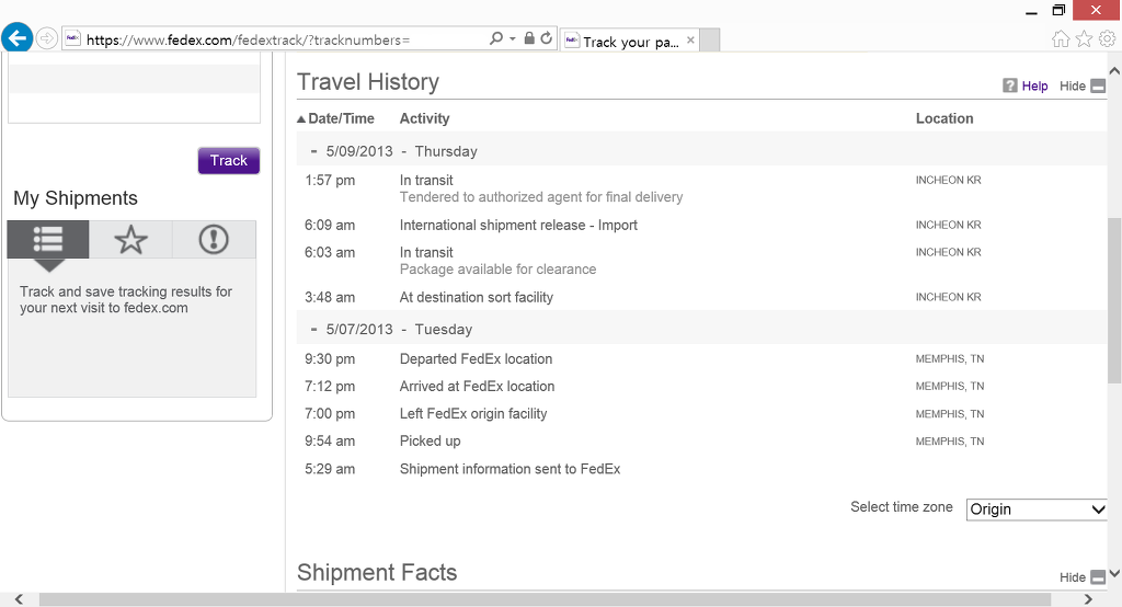 주문한 키트는 5월 7일 멤피스의 페덱스사무소에서 발송되어 5월 9일 저녁에 인천세관을 거쳐 국내택배협력업체인 CJ택배로 배송되었습니다.