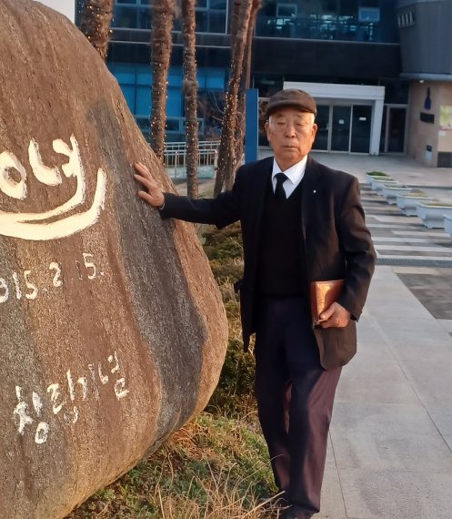 제주도 서귀포시 색달동 제주중문교회 창립 100주년 기념비 앞에 선 원응두 장로.