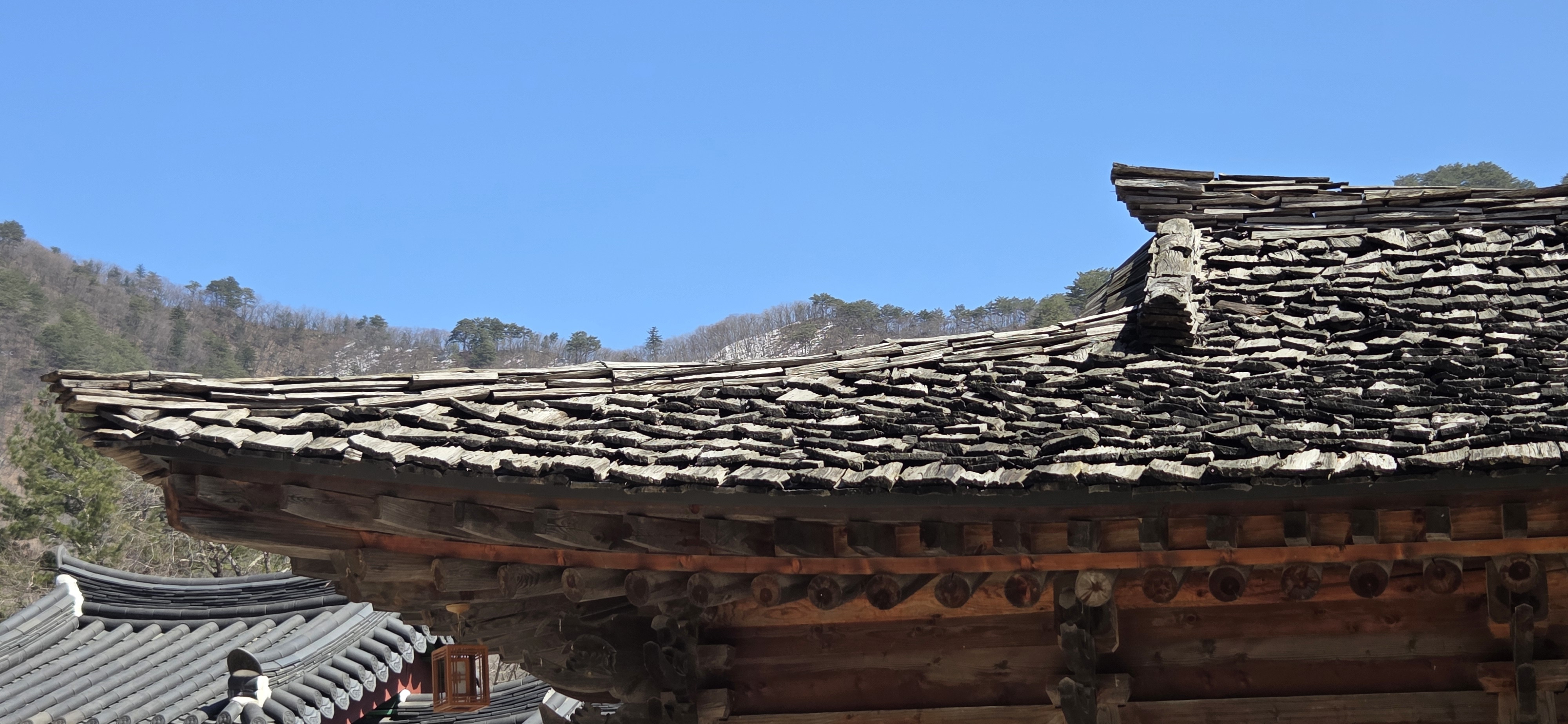 처음보는 두꺼운 나무판자로 지붕을 덮은 건물