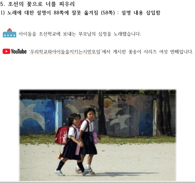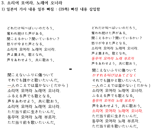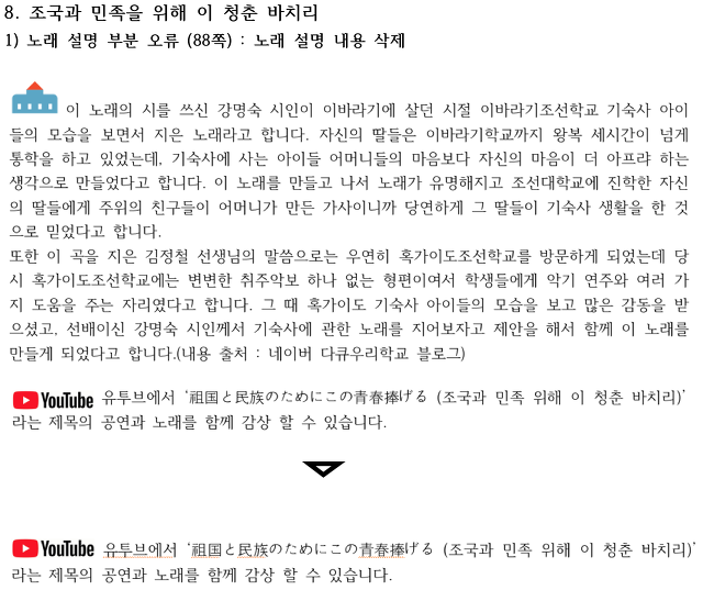 ※ 본 오류 수정 내용 중 5번(조선의 꽃으로 너를 피우리), 8번 부분(조국과 민족을 위해 이 청춘 바치리) 오류 부분은 별도로 책에 부착할 수 있는 '수정용 스티커'를 제작 해 두었습니다. 본 수정용 스티커를 수령하고자 하는 회원분들이 계시면 아래 댓글에 '비밀'로하여 주소를 남겨주시면 저희가 우편으로 발송하여 드리고자 합니다.