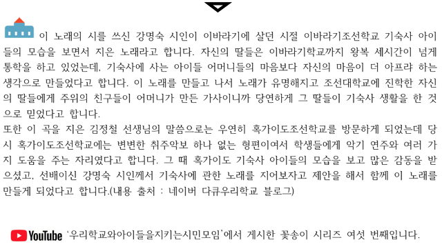 ※ '아이들아 이것이 우리학교다' 악보는 이지상씨 3집 앨범에 수록된 음원을 기본으로 악보를 만들었습니다. 이 후 세월이 흐르면서 남쪽 많은 분들, 그리고 일본에 계시는 많은 동포분들이 이 노래를 불러 주셨습니다.