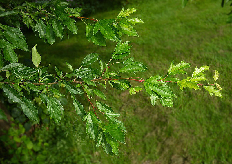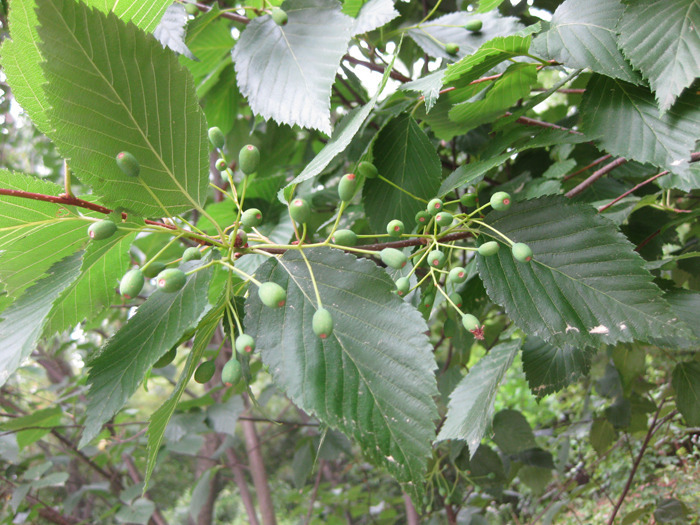 ◉ 잎은 어긋나고 잎 가장자리에 불규칙한 겹톱니가 있으며, 잎 뒷면의 측맥이 뚜렷하다.