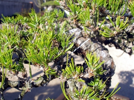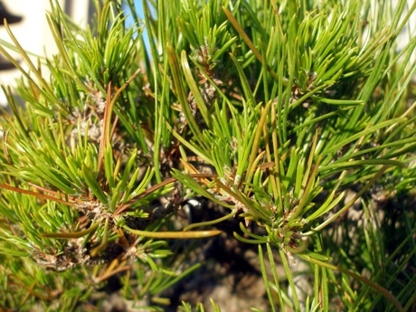 나무를 손질하기 전의 모습으로 갈색의 2년전 잎과 적심후의 남겨진 잎,