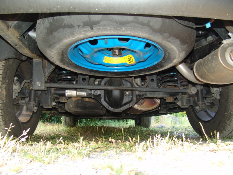 - 5링크의 큰 둥그런통과 좌우 구동축 일체형 파이프 대신에 널쩍한 'U' 형태의 판이 있고 그 판위에 코일스프링과 쇼바(속업소버)가 얹어져 있으며