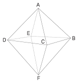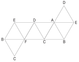 편의상 정8면체의 각 정점에 <그림Ⅰ>과 같이 A~F 라는 부호를 붙인다. 문제의 그림에서 검게 칠해져 있는 부분은, 삼각형 ABC의 정점 A부분과 삼각형CDF의 정점의 부분이 된다. A~F의 부호를 확실히 표시해서3) 선택지 ①과 같은 배치로 전개도를 그리면 <그림Ⅱ>와 같이 된다. 검게 칠해지고 있는 부분은 삼각형 CDF의 정점 F의 부분이어서, 선택지 ①은 올바르지 않다는 것을 알 수 있다. 같은 방법으로 각 선택지를 검토해 간다. | |