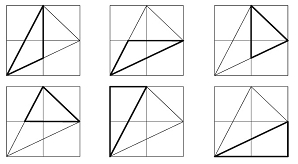 우선 다음과 같은 경우로 나누어 볼 수 있다. (1) 최소단위의 삼각형(삼각형의 내부를 선이 가로 지르지 않는 삼각형= 횡단하지 않는 삼각형) (2) 도형 두 개로 구성되고 있는 삼각형 (삼각형 내부를 선이 한 줄만 가로 지르고 있는 삼각형= 횡단하는 삼각형) [그림 1] 이 삼각형은 [그림2]와 같이 세어 가면 된다. 굵은 선으로 둘려 쌓인 삼각형이 해당하는 삼각형이다. 그림에서 보면 이와 같은 삼각형이 6개 있다는 것을 알 수 있다.
