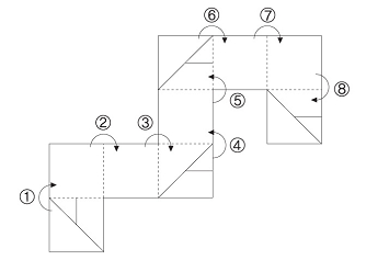 아래 그림과 같이 투명한 셀로판지로 만든 같은 크기의 정사각형 9개를 이어서 합친 모양을 그려 점선이 맞닿는 곳을 시작으로 해서 ①부터 ⑧까지 화살표 방향을 따라 차례로 접으면서 개어나간다. 이때 ⑧까지 접었을 때 보이는 정사각형 모양으로서 올바른 것은 어느 것인가? |