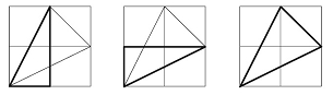 (3) 도형 두 개 이상으로 구성되고 있는 삼각형 (삼각형 내부를 선이 둘 이상 가로지르고 있는 삼각형) 이 삼각형은 그림 3과 같이 세면된다. 굵은 선으로 둘려 쌓인 삼각형이 해당하는 삼각형이다. 그림에서 이와 같은 삼각형은 3개 있음을 알 수 있다. 그러므로 (1) ∼(3)에서, 주어진 도형 속에 있는 삼각형의 수는 6 + 6 + 3 = 15 개임을 알 수 있다. 따라서 정답은 ④번 | |