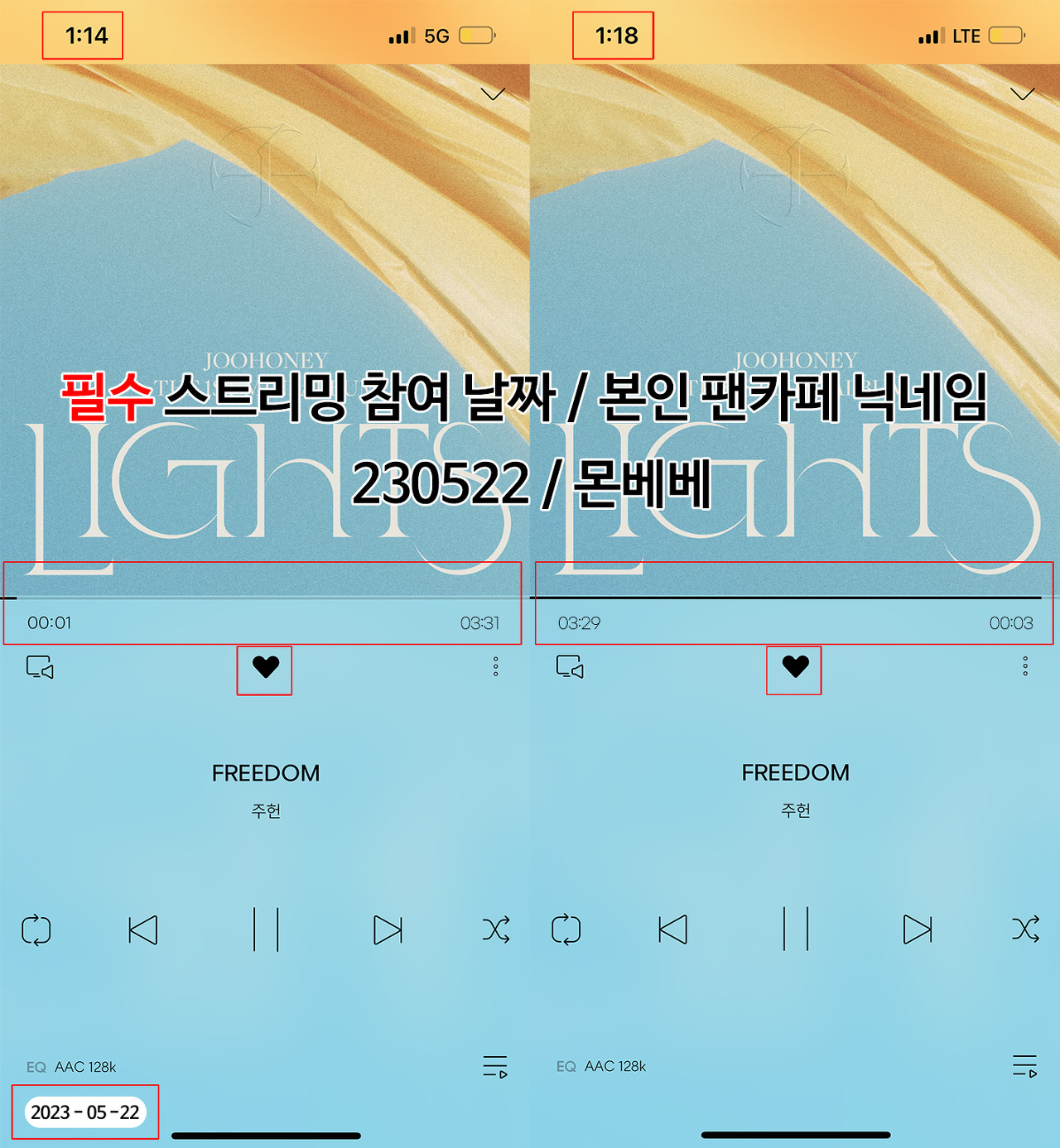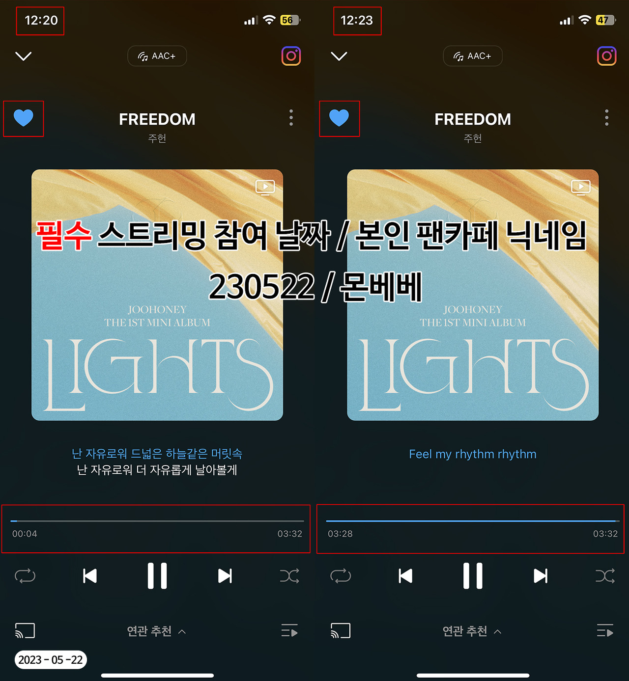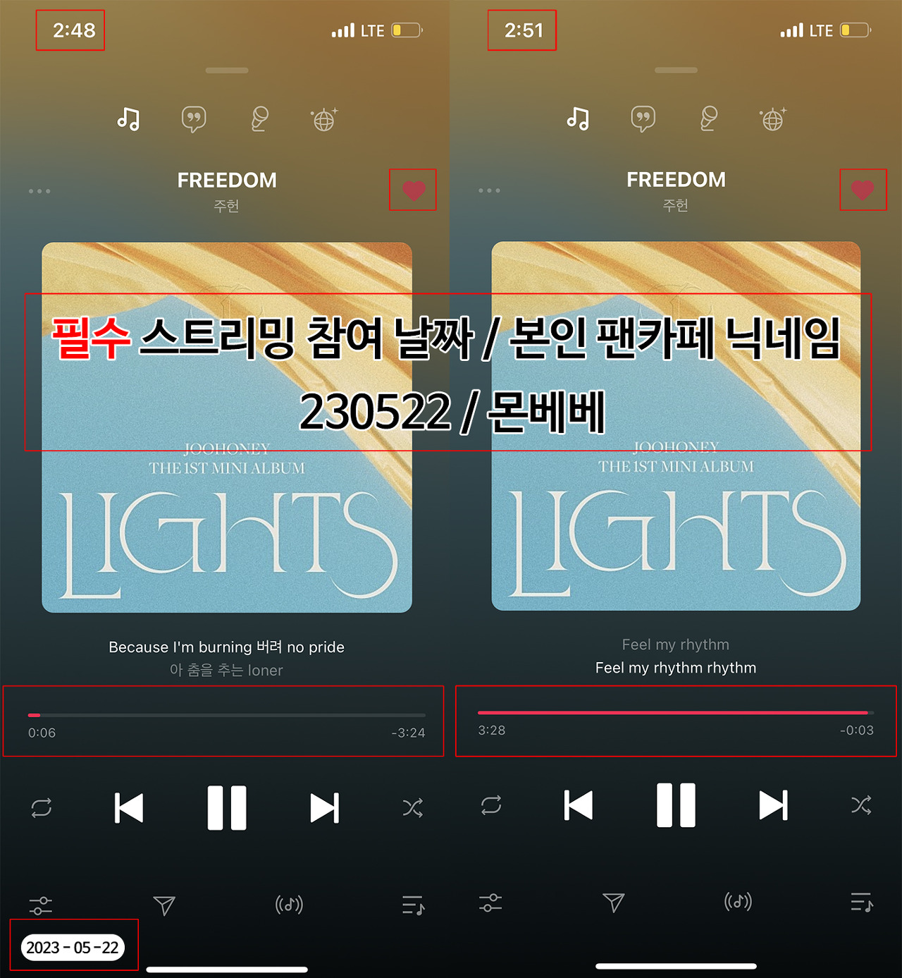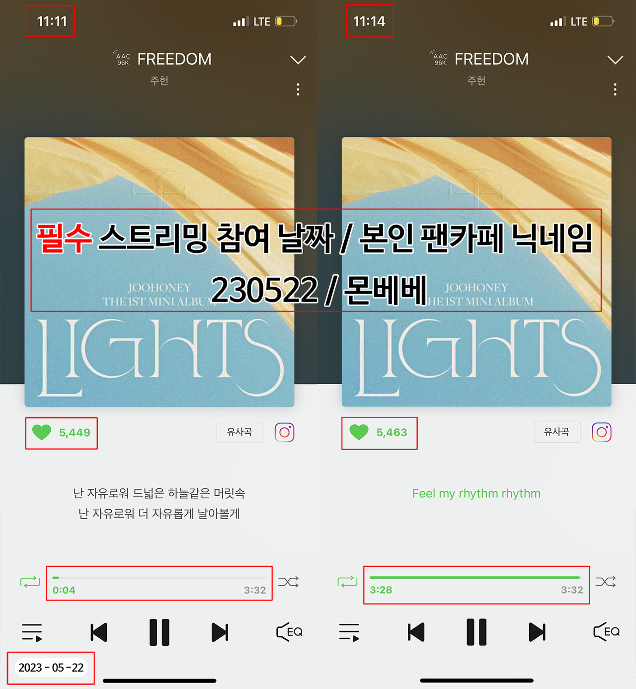 ※ 빨간 박스로 표시되어 있는 부분이 모두 보여야 인정되며, 스트리밍 참여 날짜와 본인 팬카페 닉네임을 반드시 기재하여 주시기 바랍니다.
