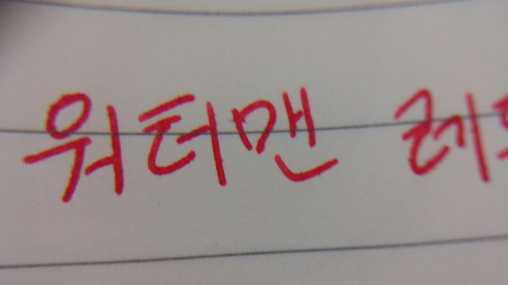 워터맨 레드와 비교해 봤을때 홍옆은 색에 핑크가 많이 들어간거 같습니다. 코랄색상?과 비슷해 보이네요. 워터맨 레드보단 농담지는 수성 잉크다운 잉크같습니다.