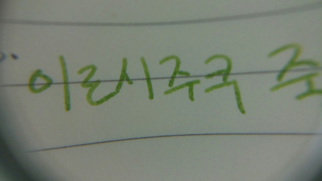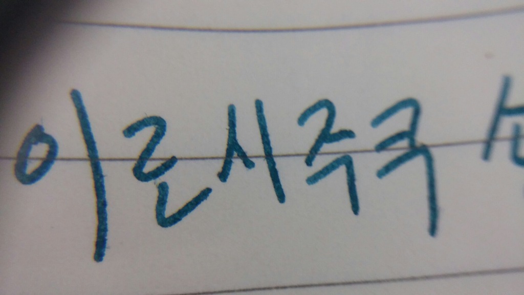 이로시주쿠를 처음 써봤는데 색깔 변하는게 정말 매력적입니다. 펜촉에서 종이로 바로 묻어나올땐 맑고 푸른 청색이 나옵니다. 하지만 이후 잉크가 마르면 아래와 같이 솔잎 색이 나오죠. 이로시주쿠 잉크들이 농담이 잘 안지는거 같습니다. 물론 만년필 잉크의 특징상 농담이 안질수는 없습니다만 얘네는 다른 브랜드에 비하면 꽤나 일관된 농담을 보여줍니다. 실번짐은 일단 송로가 다른 이로시주쿠 색들 보다 많네요.