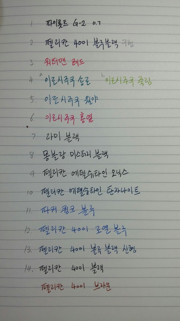 추가 된 잉크: 이로시주쿠- 홍옆, 월야, 송로, 죽림 / 몽블랑- 미스터리 블랙 / 신형 펠리칸 4001-블루블랙, 브라운