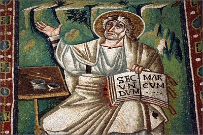 [산 비탈레 성당의 St. 마태의 모자이크. 좌측 중앙에 퀼펜과 리드펜이 보인다.]