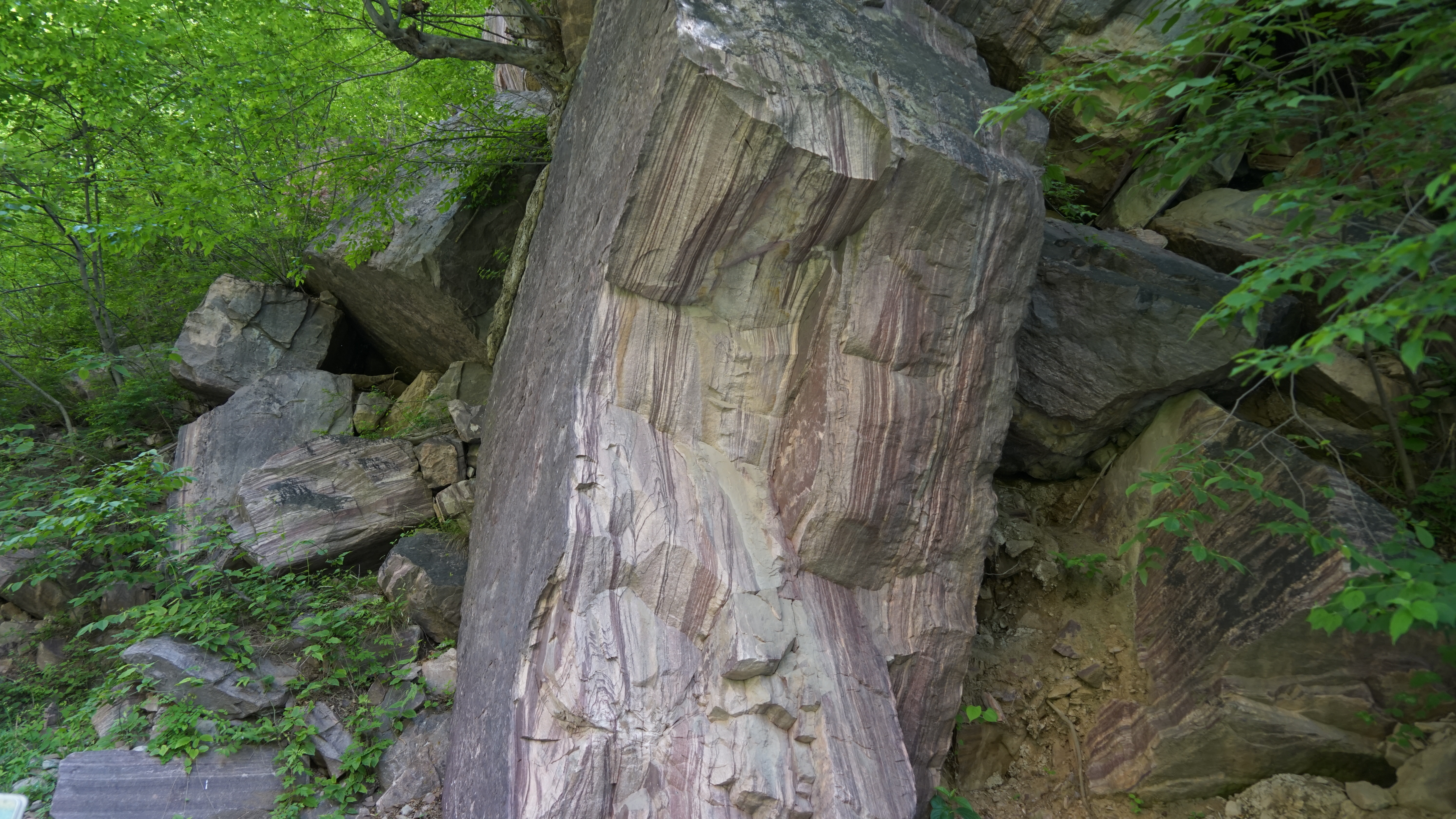 절벽에서 굴러떨어진 바위...압력에 의새서 납작해진 모습이 보인다....이곳도 옛날에는 강바닥이었거나 바다의 바닥이었을 것이
