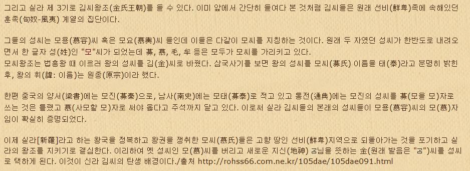 즉 성씨를 모(용)씨에서 金씨로 바꾼 법흥왕이 숨진 뒤 얼마 되지 않아 신라 金씨 왕실은 자신들의 뿌리를 감추는 일종의 「알리바이 조작 작업」을 펼쳤으니 바로 국사의 편찬인 것이다. 이 때문에 金씨의 뿌리가 모용씨였다는 사실은 철저히 인멸됐을 것이다.