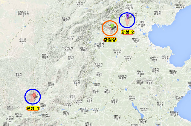 왕검성 ‧ 섬서성 한성1 ‧ 하북성 한성2의 위치 |