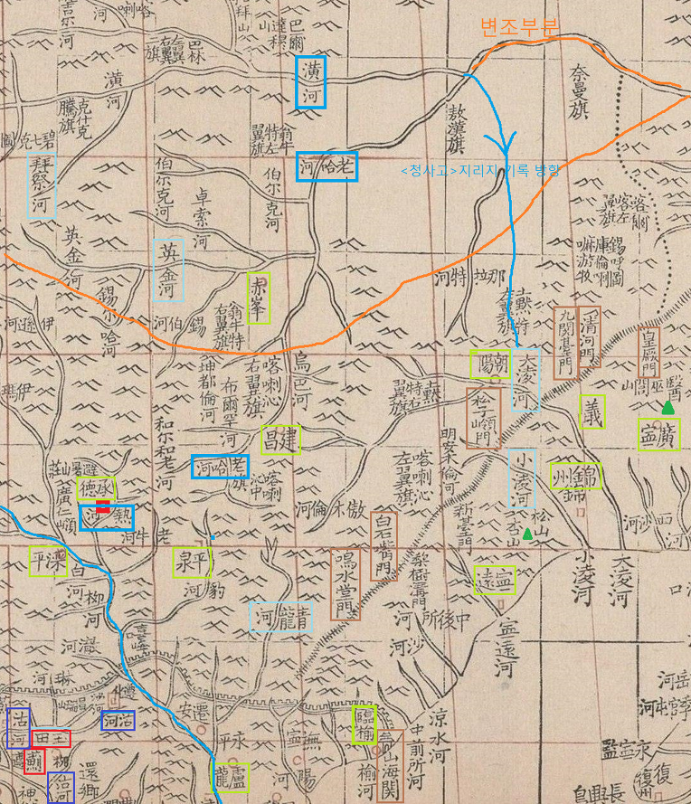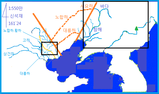 표시한 노합하.황하의 하류는 요하로 합쳐지기는 하였으나 조양으로 흘러든 후 요하로 합쳐졌으며 그 요하도 지금의 요하가 아니라 지금의 란하를 말하는 것이였습니다.