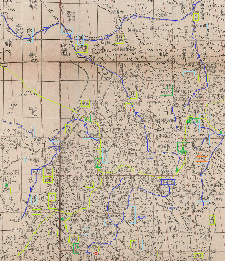 앞 글에서는 청 시기의 대청도, 명 시기의 요양총도에 백지 상태로 둔 대릉하 상류 지역을 지리지 기록으로 살펴보았습니다. 이제 그 지역을 묘사한 <황조일통여지전도>(이하 황조도라 함)의 극히 일부분도를 제시하며 출처는 향고도 다음 블로그입니다.