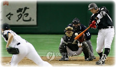 <사진:김태균(28.지바롯데 마린스)이 3월13일 도쿄돔에서 열린 일본프로야구 니혼햄과 시범경기에서 일본 최고 투수로 평가 받는 니혼햄 선발 다르빗슈의 공을 받아쳐 비거리140미터 홈런을 생산했다. 사진:연합뉴스>