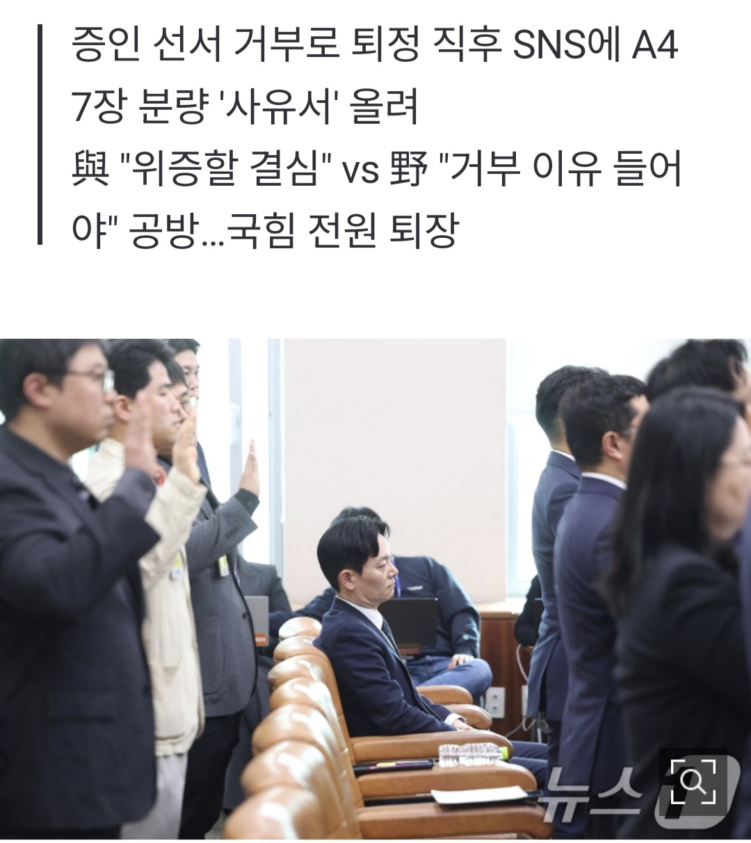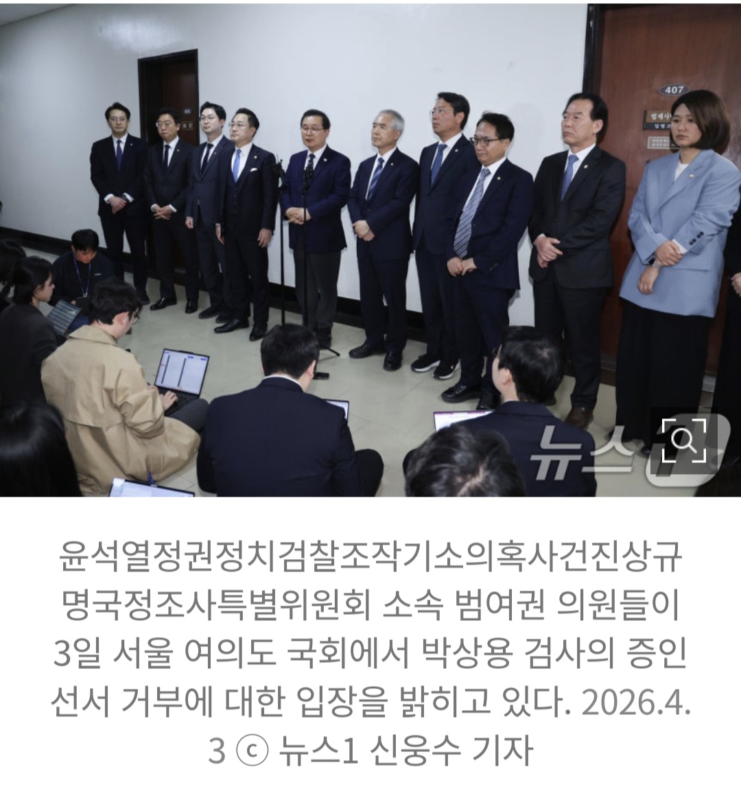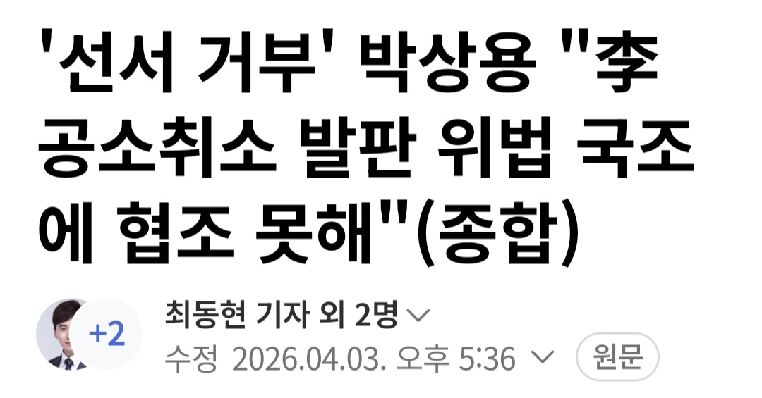 '선서 거부' 박상용 "李 공소취소 발판 위법 국조에 협조 못해" 작성자달그리메(대구)|작성시간26.04.03|조회수8 목록 댓글 1 글자크기 작게가 글자크기 크게가 https://naver.me/IFEwADIa 다음검색 현재 게시글 추가 기능 열기 북마크 공유하기 신고 센터로 신고 댓글 댓글 1 댓글쓰기 답글쓰기 댓글 리스트 작성자달그리메(대구) 작성자 본인 여부 작성자 | 작성시간 26.04.03 new '선서 거부' 박상용 "李 공소취소 발판 위법 국조에 협조 못해"증인 선서 거부로 퇴정 직후 SNS에 A4 7장 분량 '사유서' 올려與 "위증할 결심" 野 "거부 이유 들어야" 국힘 전원 퇴장 댓글 전체보기