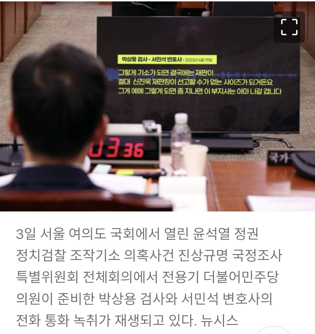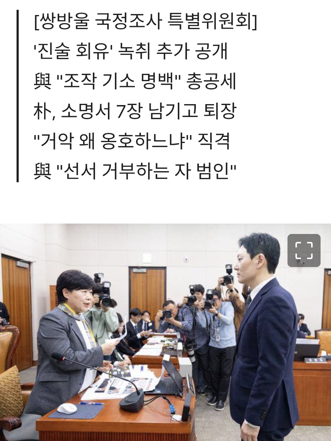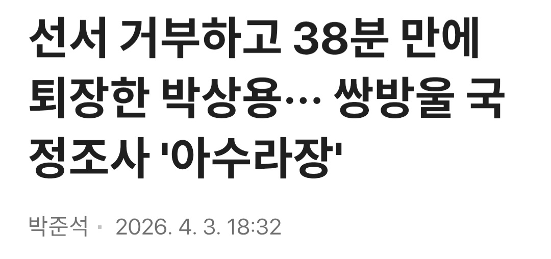 선서 거부하고 38분 만에 퇴장한 박상용··· 쌍방울 국정조사 '아수라장' 작성자달그리메(대구)|작성시간26.04.03|조회수16 목록 댓글 1 글자크기 작게가 글자크기 크게가 https://naver.me/FKGaRrXM 다음검색 현재 게시글 추가 기능 열기 북마크 공유하기 신고 센터로 신고 댓글 댓글 1 댓글쓰기 답글쓰기 댓글 리스트 작성자달그리메(대구) 작성자 본인 여부 작성자 | 작성시간 26.04.03 new 선서 거부하고 38분 만에 퇴장한 박상용쌍방울 국정조사'아수라장'쌍방울 국정조사 특별위원회'진술 회유' 녹취 추가 공개與 "조작 기소 명백" 총공세朴, 소명서 7장 남기고 퇴장"거악 왜 옹호하느냐" 與 "선서 거부하는 자 범인" 댓글 전체보기