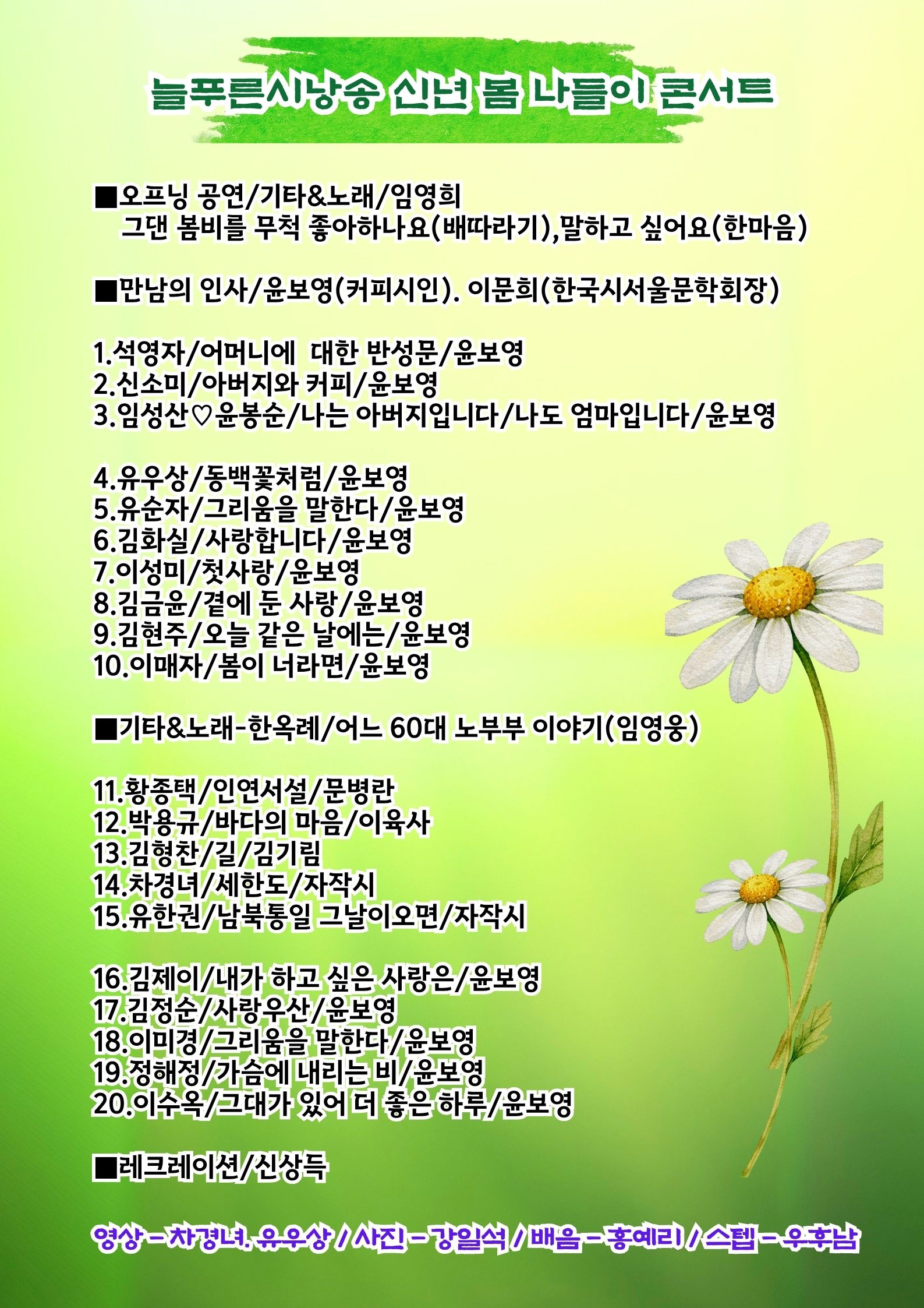 한국시서울문학회 "석영자 낭송회장"님이 이끄시는 “늘푸른시낭송회” 신년 봄 나들이 콘서트에 다녀왔습니다.