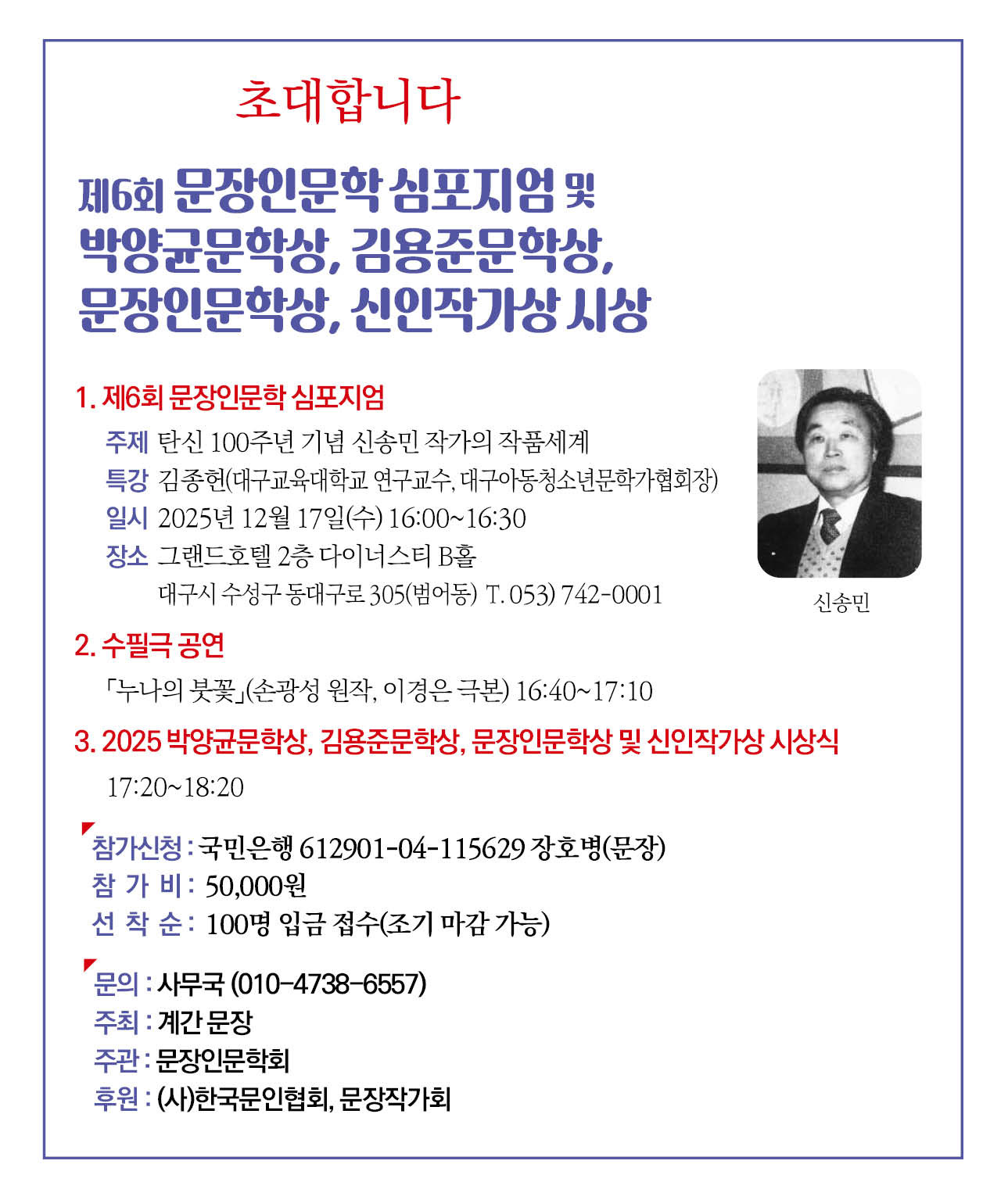 제6회 문장인문학 심포지엄 및 박양균문학상, 김용준문학상, 문장인문학상, 신인상 작성자문장인문학회|작성시간25.11.24|조회수70 목록 댓글 0 글자크기 작게가 글자크기 크게가 다음검색 현재 게시글 추가 기능 열기 북마크 공유하기 신고 센터로 신고 댓글 댓글 0 댓글쓰기 답글쓰기 댓글 리스트